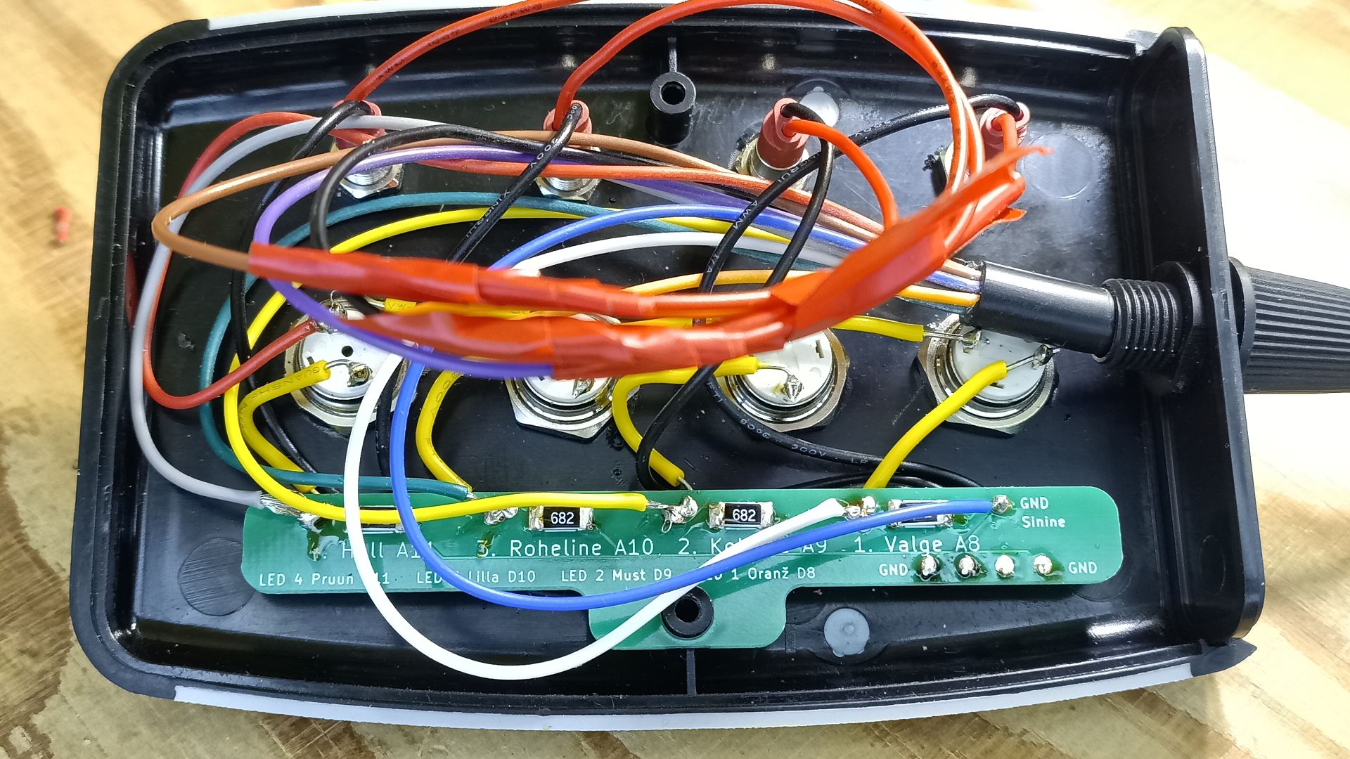 Juhtmestuse lihtsustamiseks on plaadil ära toodud juhtmete värvid ja millisesse porti need on ühendatud. |