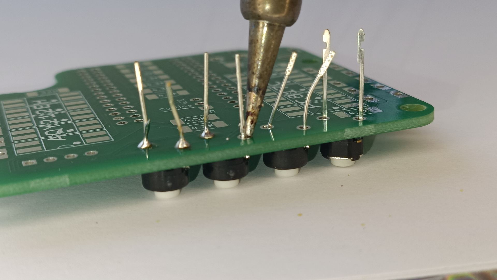 Vedrunuppude puhul torka nende jalad läbi trükiplaadi ja aseta tagurpidi lauale - nii ei kuku nupud välja ja jootekolviga jalaaugu servale vajutades surud plaadi samal ajal ka vastu nuppu. |