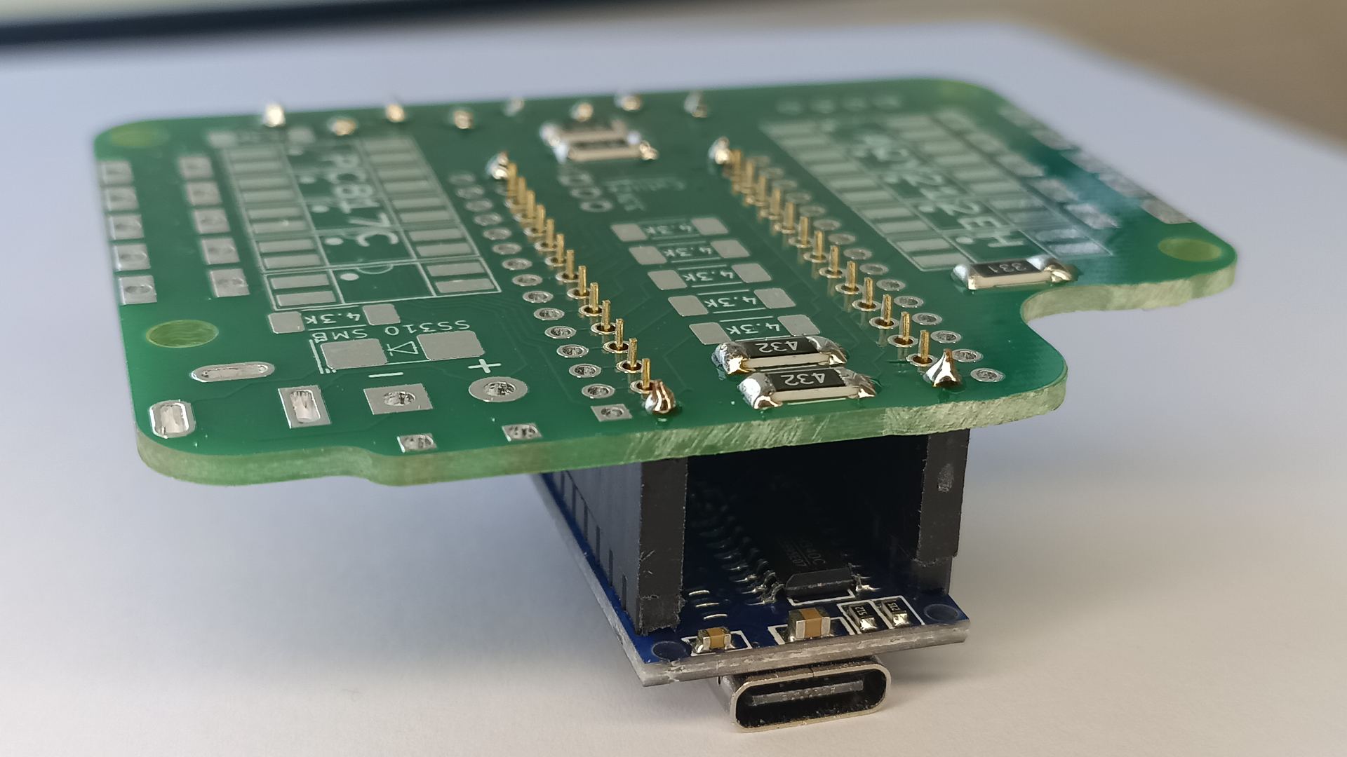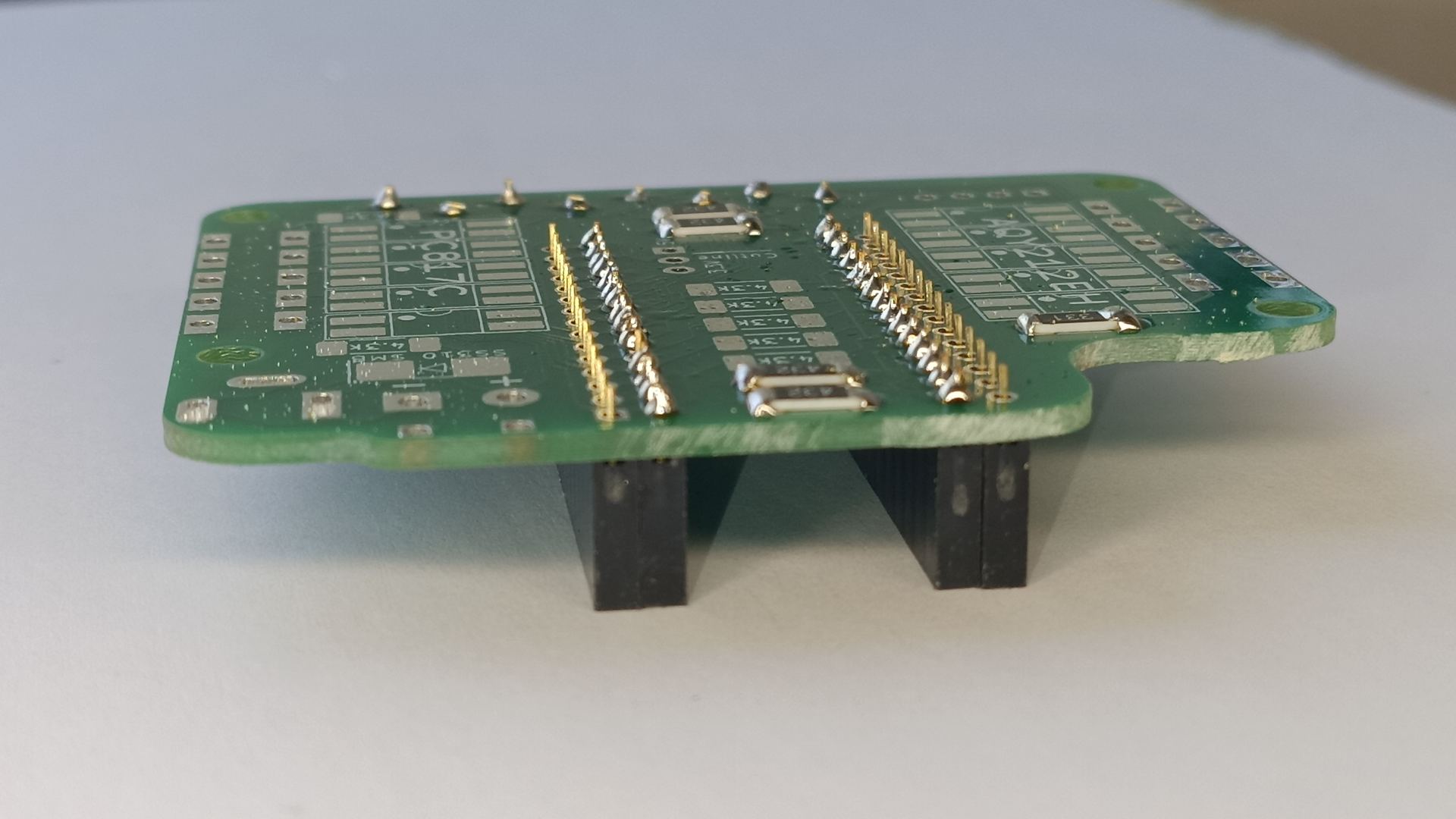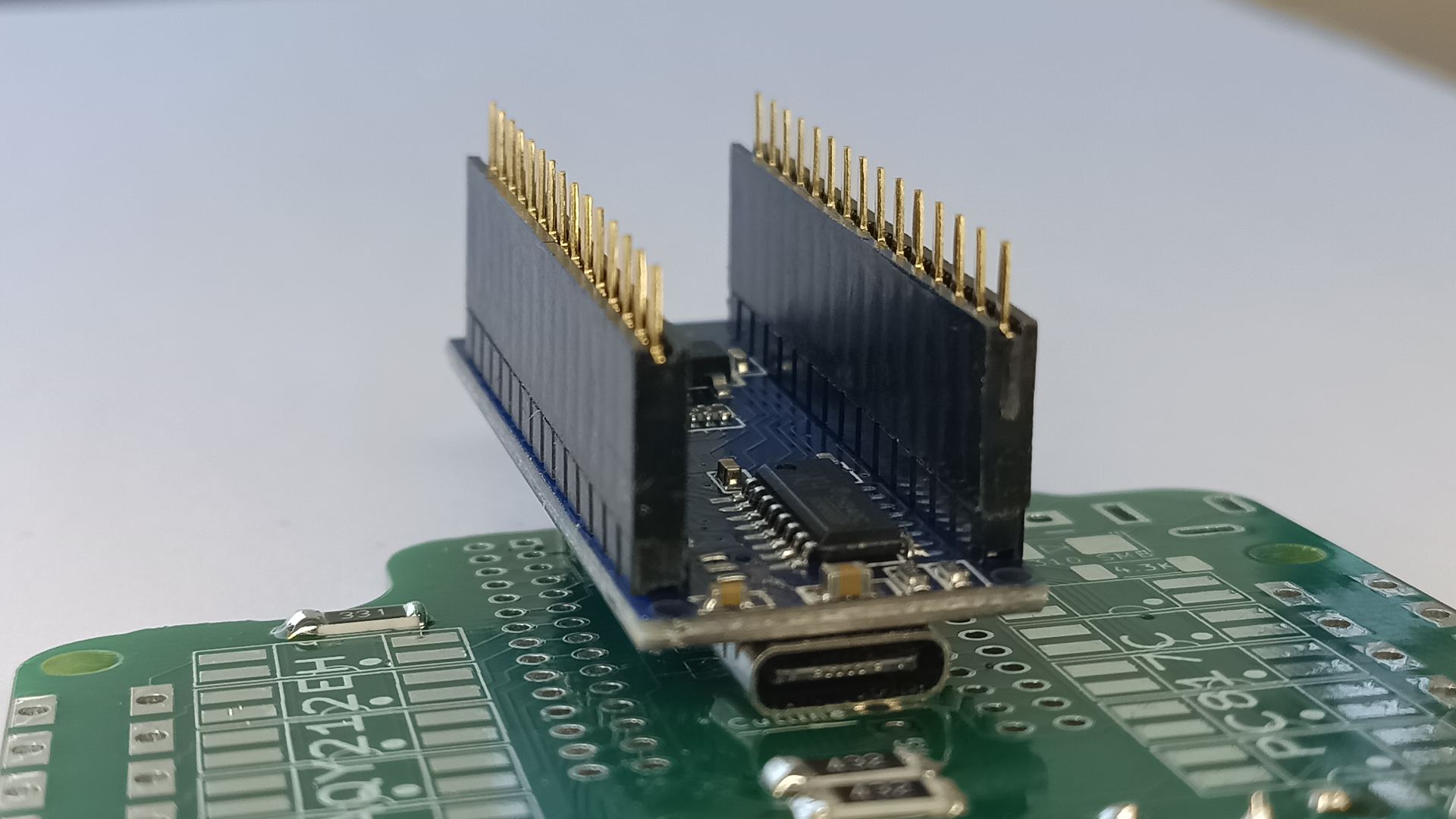 Välimiste klemmliistude paigaldamiseks eemalda mikrokontroller ja paiguta plaat lauale nagu näha alloleval pildil. Kontrolli üle, kas klemmliistud on tihedalt üksteise vastas. |