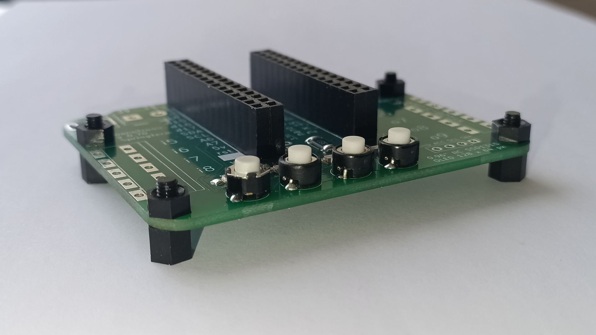 Alustame nelja nupu ja led tulega, mille toimimiseks on vaja plaadile joota ka mõned takistid. Mikrokontrolleri ühendamiseks on 15 klemmiga liistud.