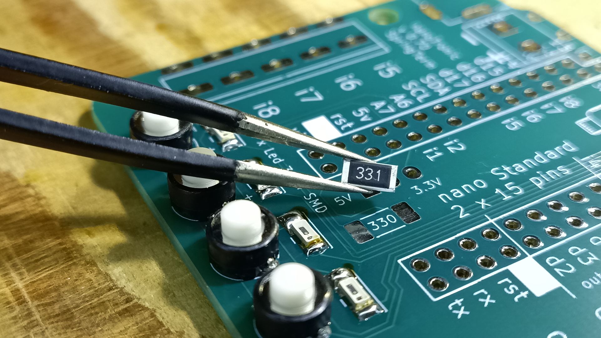 Järgmiseks jooda külge kaks 330 Ω takistit. Komponendil on markeering 331.