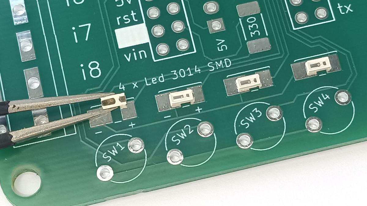 Esmalt alusta LED tulede paigaldamisest, need on plaadi esiküljel. Jälgi kindlasti polaarsust, alumisel poolel olev kitsam klemm läheb + poolele ja laiem - poolele.