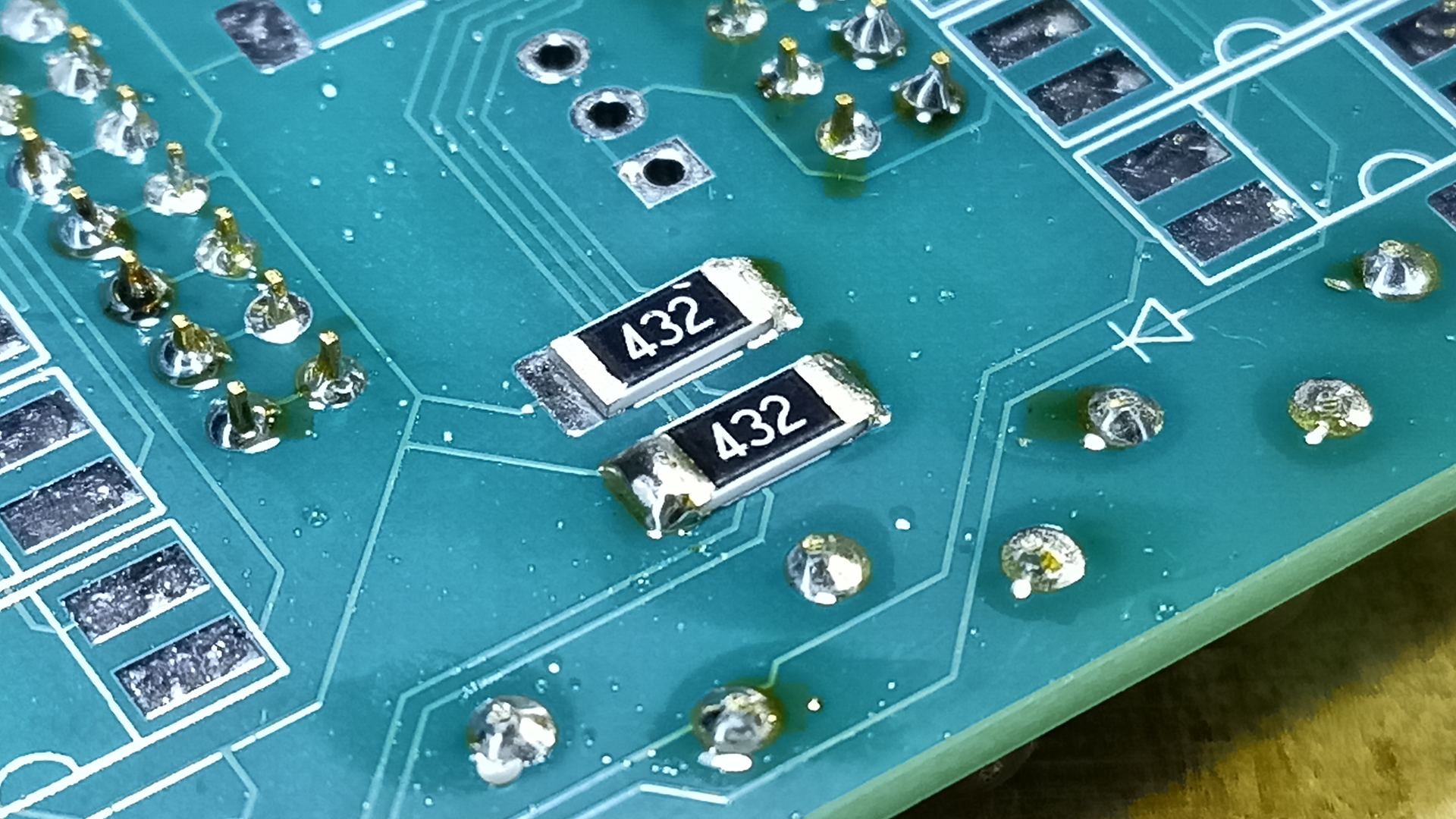 Kontrolli üle ka takistid. Vaata üle, kas kõigil on mõlemad küljed joodetud. Juuresoleval pildil on näha kuidas ülemisel on vasak pool lahtine ja seepärast takisti ühendust ei anna. |